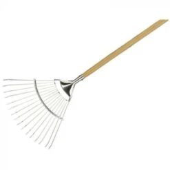Rake with curved teeth which are easily pulled through soil and gravel.